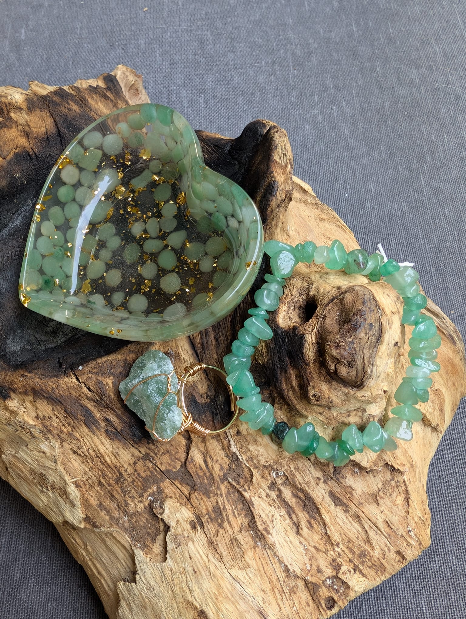 Dieses 3-teilige Set vereint eine Herz-Schale aus Harz, einen verstellbaren Gold-Ring mit Rohstein und ein dehnbares Splitter-Armband. Wählbar in Amethyst, Rosenquarz, Granat oder grünem Aventurin – für bewusste Momente im Alltag.